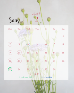 2月定休日のお知らせ 2026.01.31 2日(月) 4日(水) ono休み 9日(月) 10日(火) 16日(月) 17日(火) 23日(月) akama休み 早いものでもう2月。またまだ寒い日が続きますがみなさまくれぐれもお身体ご自愛ください。 2月も皆様のご来店お待ちしております!